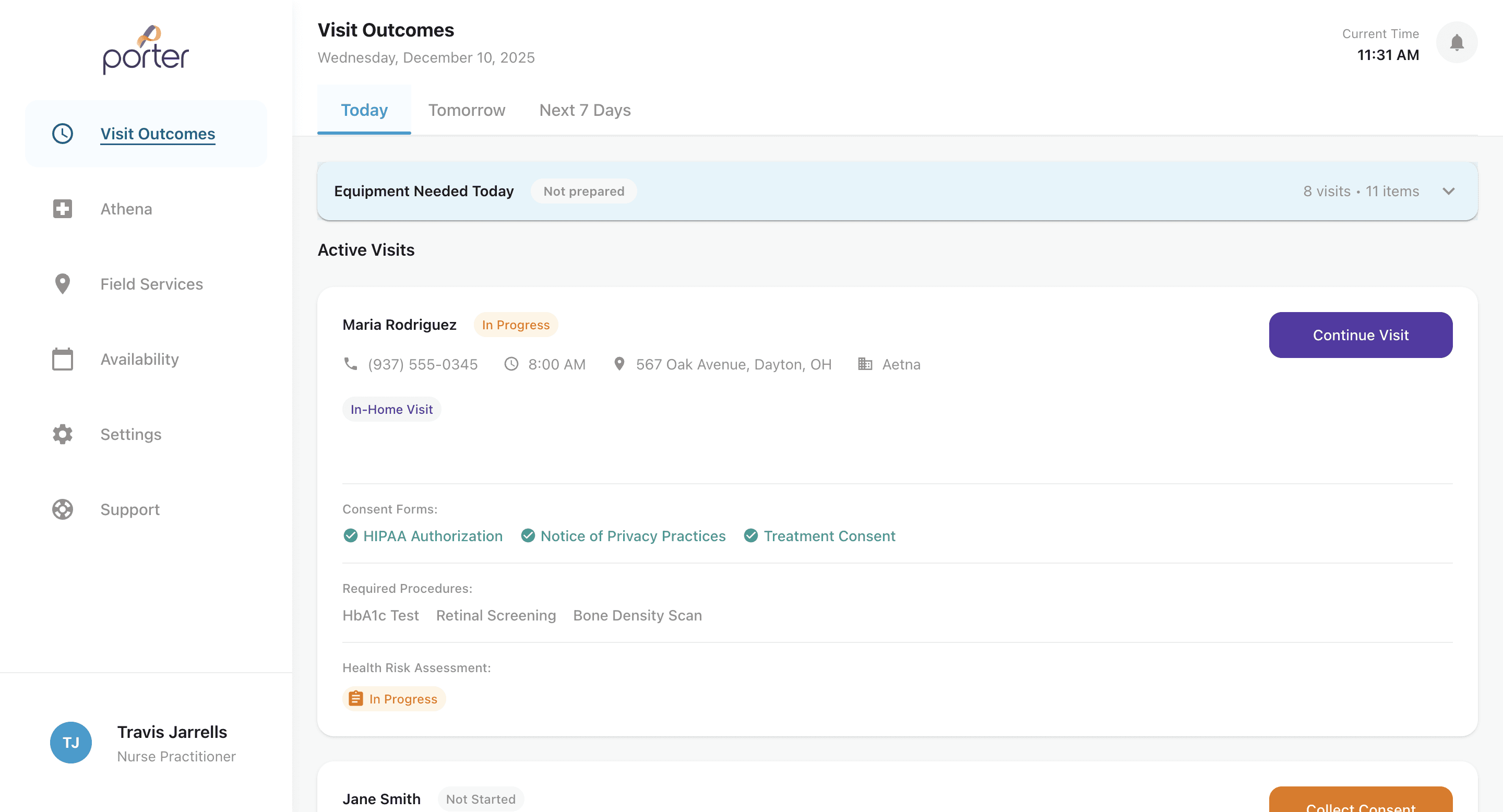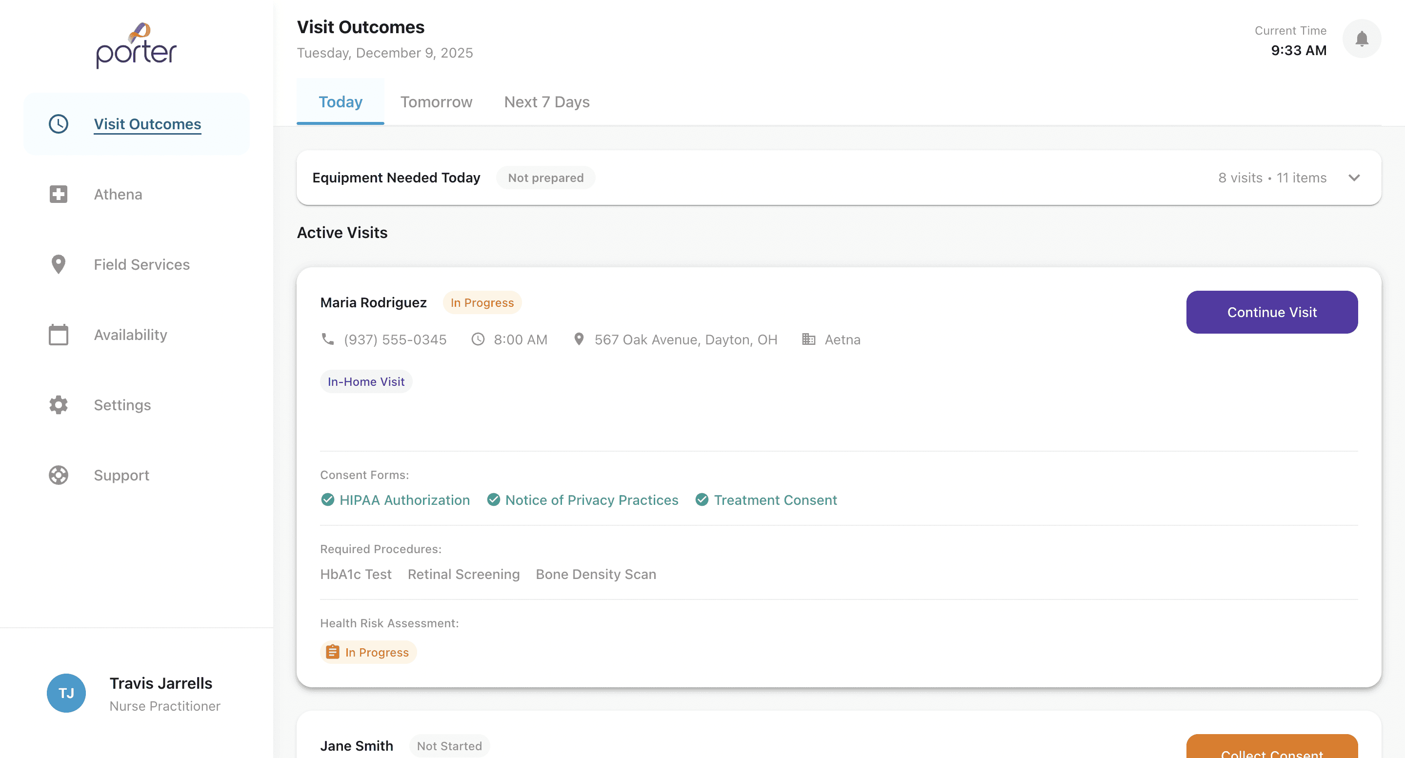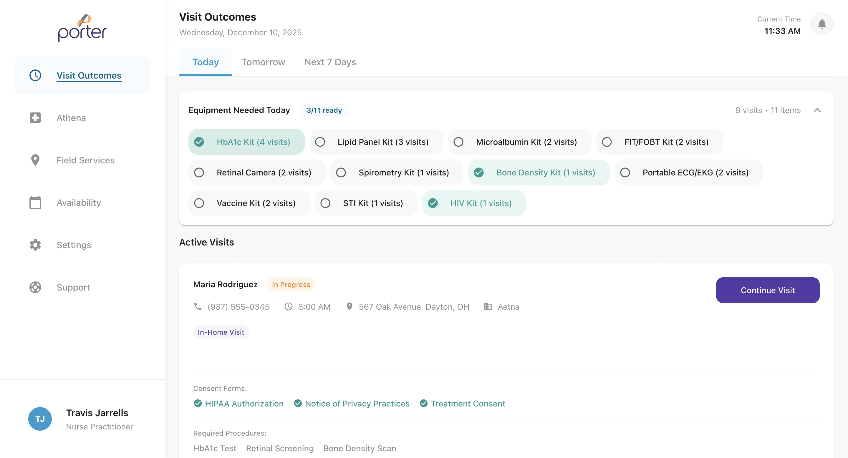 Required tools appear at the top of the visits list, allowing providers to track what equipment they have prepped for the day.
